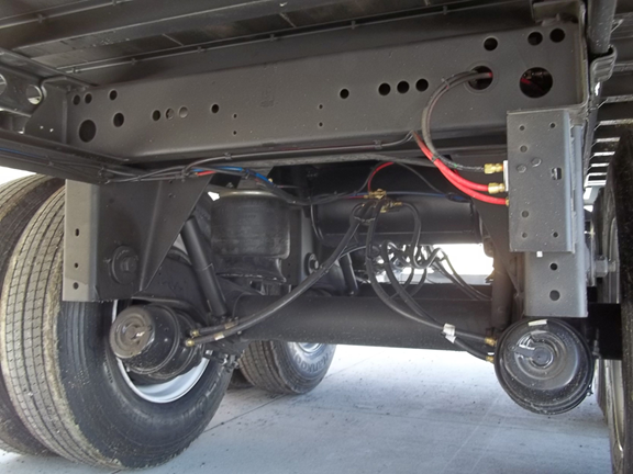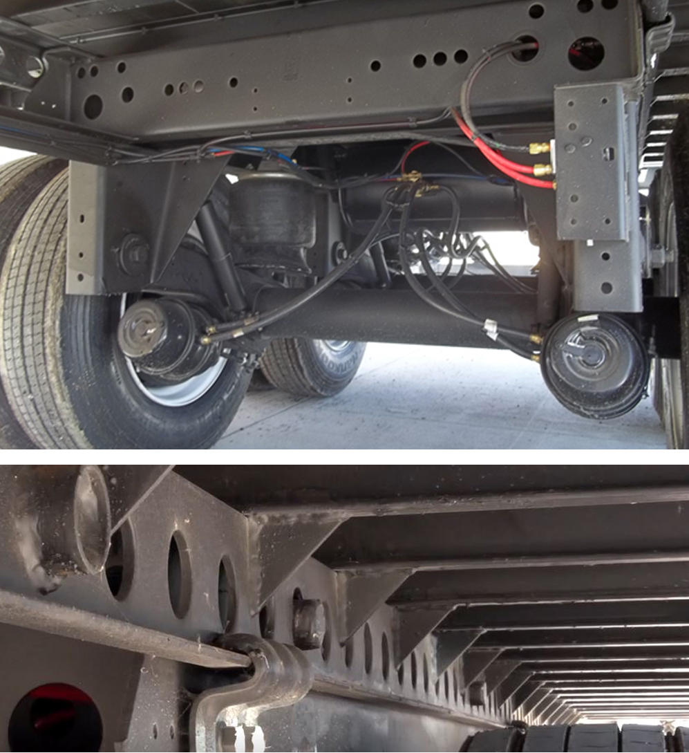 Supporting the suspension, Strick's slide rail holes make it easy to slide in tight delivery radius situations. Strick also incorporates heavier bottom flanged crossmembers at the running gear which provides a better weld joint to the slide track and enables extra balance. Added triangular gussets at each crossmember improves lateral stability to the track.