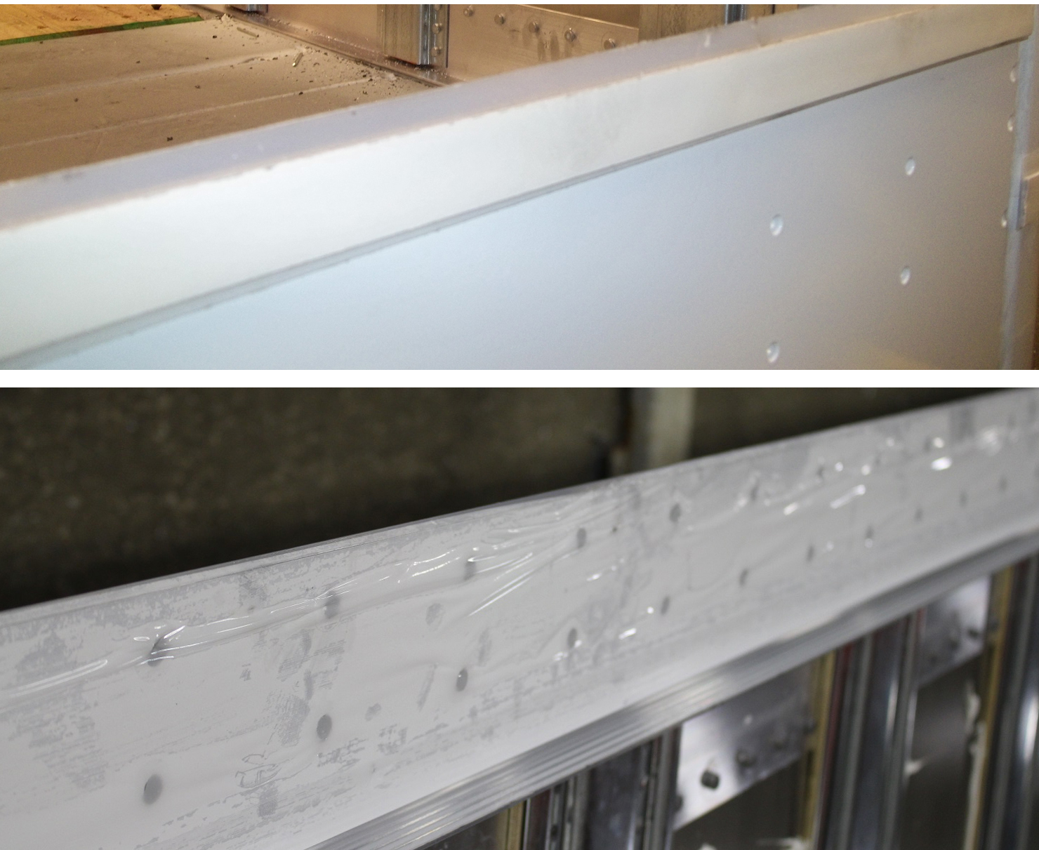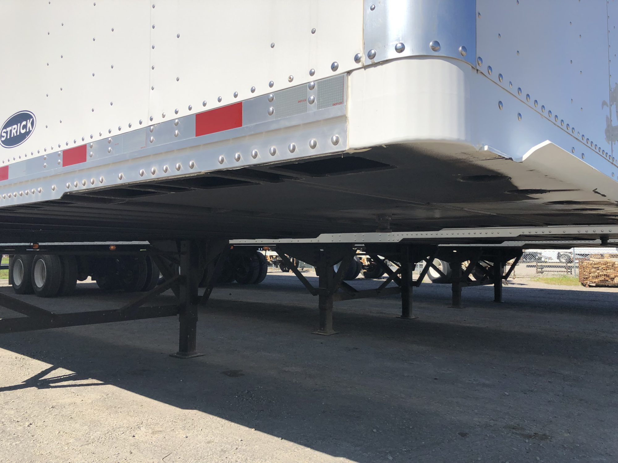Strick includes both plastic and foam barrier tape that is securely fastened to the front king pin assembly front wrap on each trailer which ensures longevity of the aluminum at the nose of the trailer. This barrier tape also helps to protect cargo inside the van from possible moisture at the nose of the trailer.